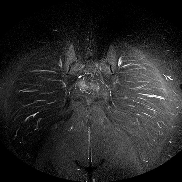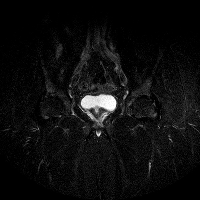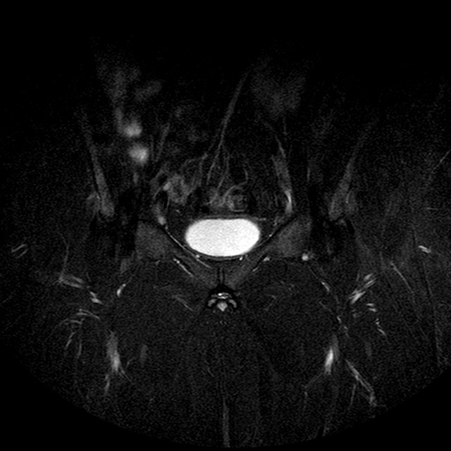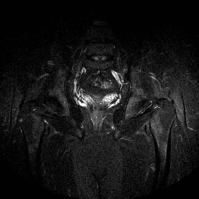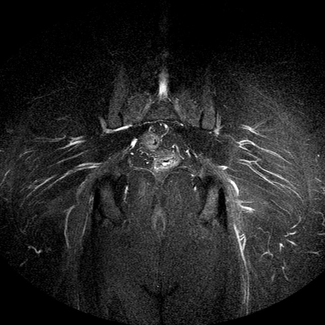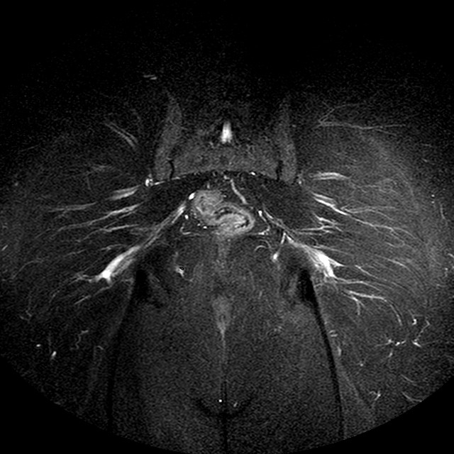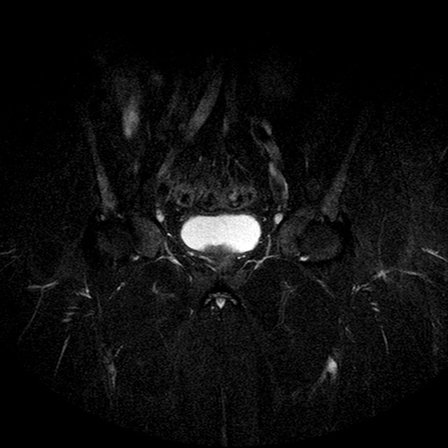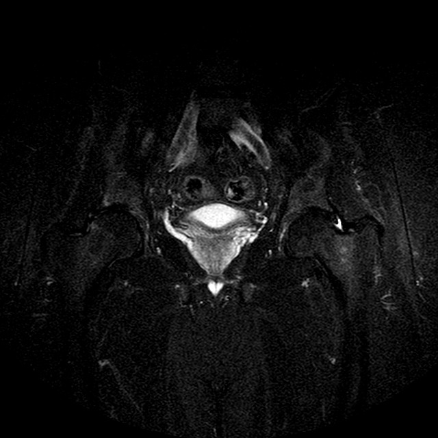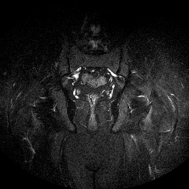 Evidenti e simmetriche alterazioni osteofitosiche in regione coxo femorale con riduzione delle rime articolari. Degenerazione completa del cercine glenoideo. Non attuali segni di versamento articolare. Non segni di edema osseo che escludono attuale algodistrofia od osteonecrosi. Lieve e simmetrica riduzione del trofismo della muscolatura glutea.