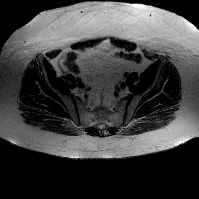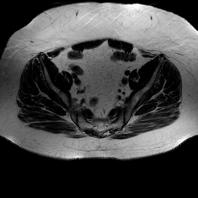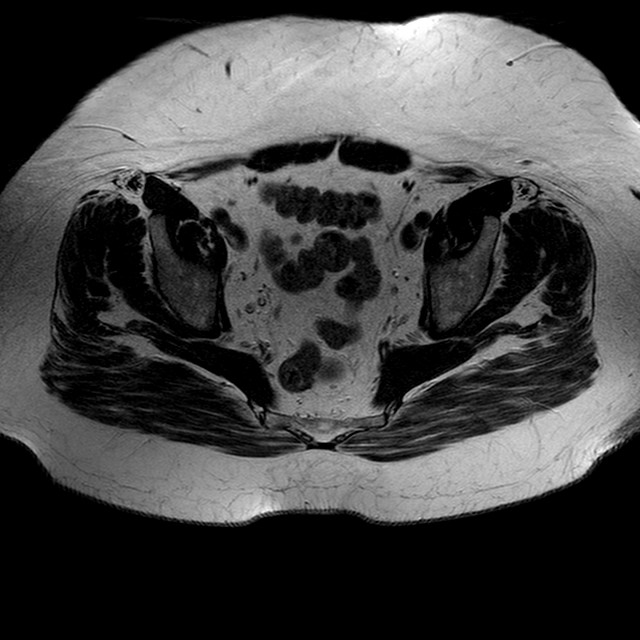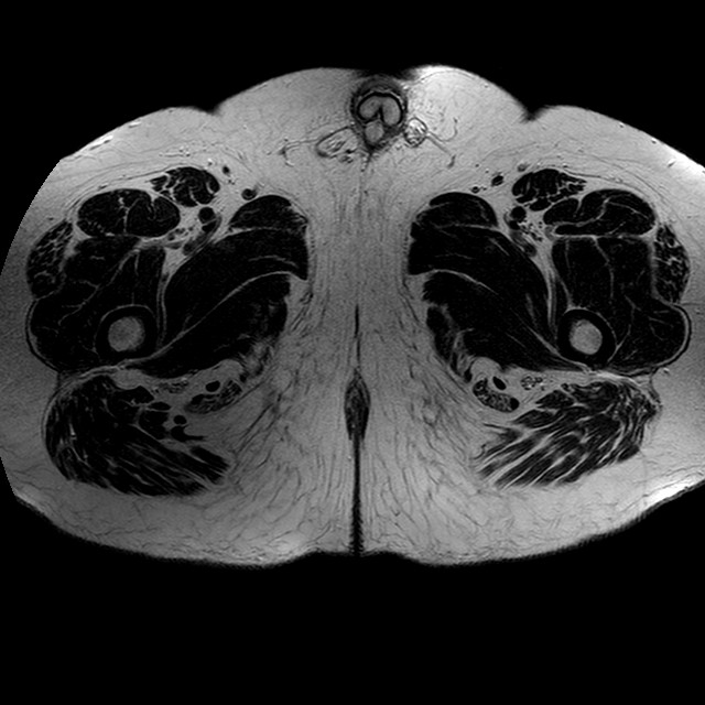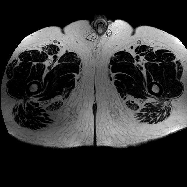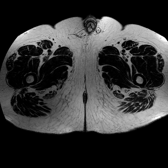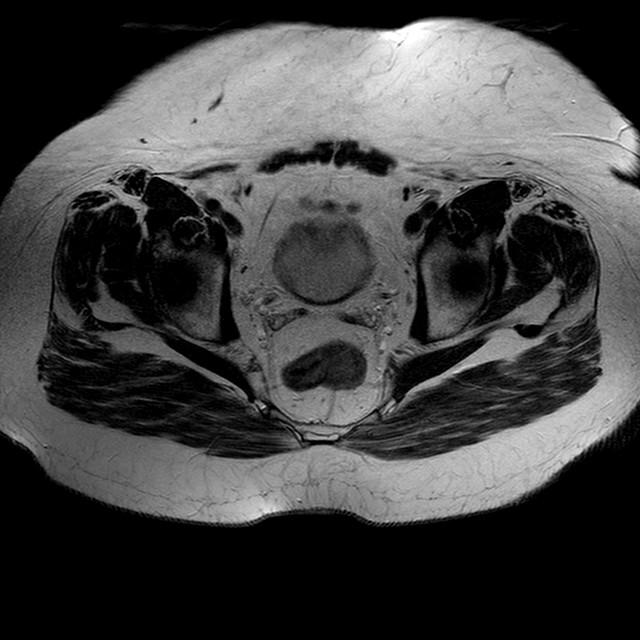 Evidenti e simmetriche alterazioni osteofitosiche in regione coxo femorale con riduzione delle rime articolari. Degenerazione completa del cercine glenoideo. Non attuali segni di versamento articolare. Non segni di edema osseo che escludono attuale algodistrofia od osteonecrosi. Lieve e simmetrica riduzione del trofismo della muscolatura glutea.