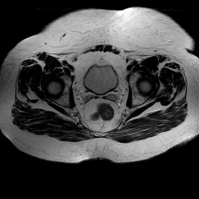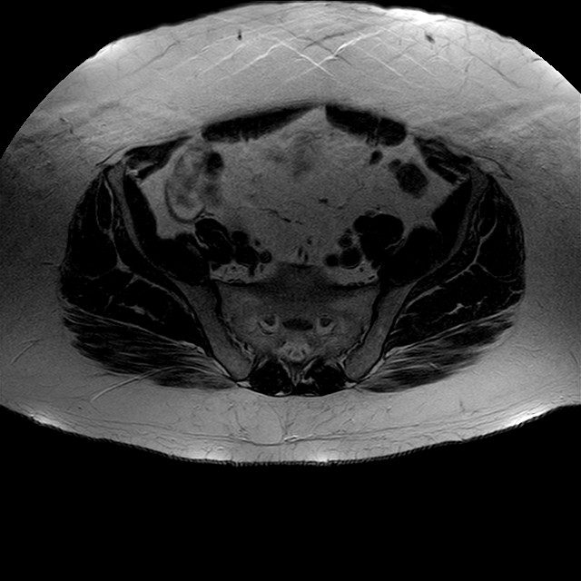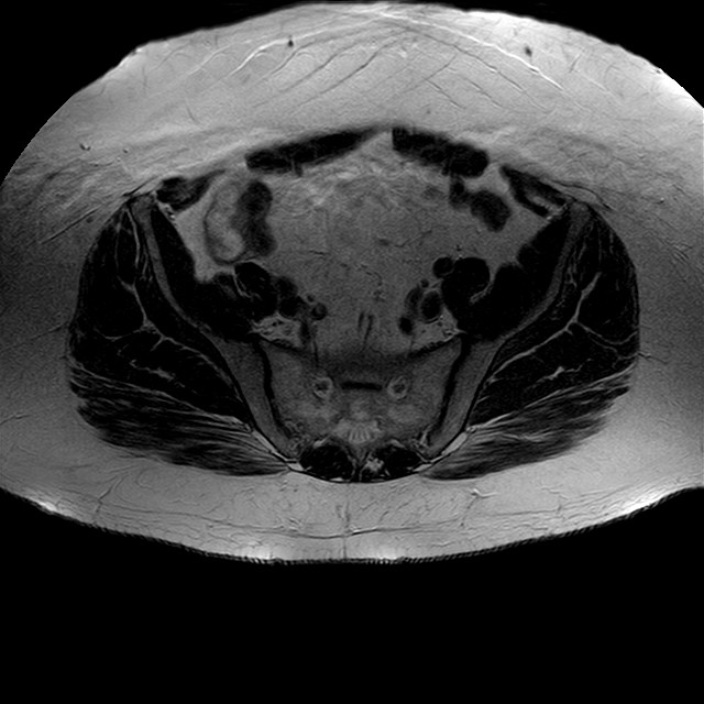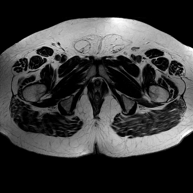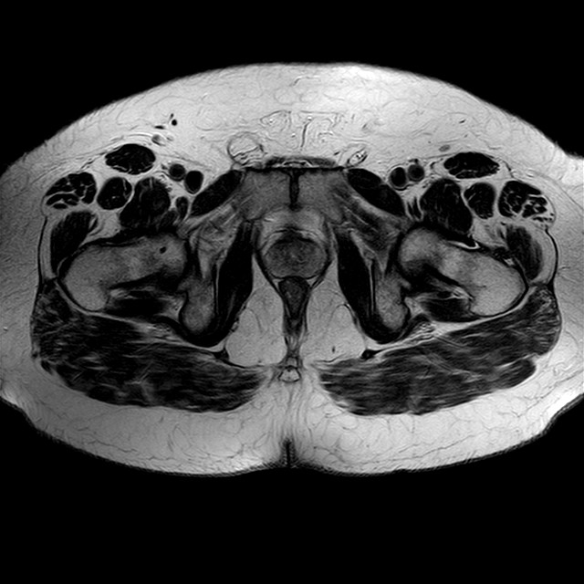 Evidenti e simmetriche alterazioni osteofitosiche in regione coxo femorale con riduzione delle rime articolari. Degenerazione completa del cercine glenoideo. Non attuali segni di versamento articolare. Non segni di edema osseo che escludono attuale algodistrofia od osteonecrosi. Lieve e simmetrica riduzione del trofismo della muscolatura glutea.
