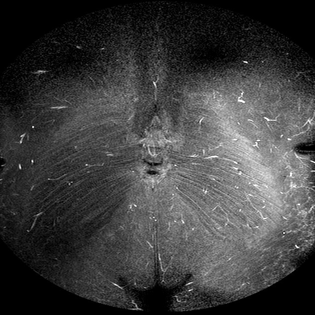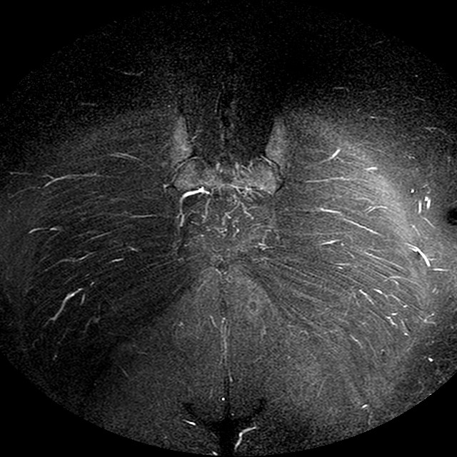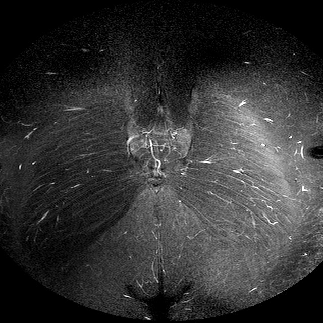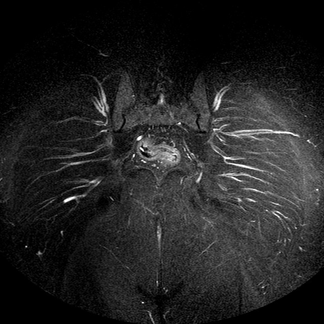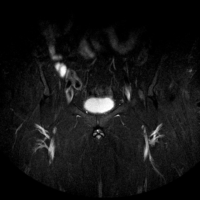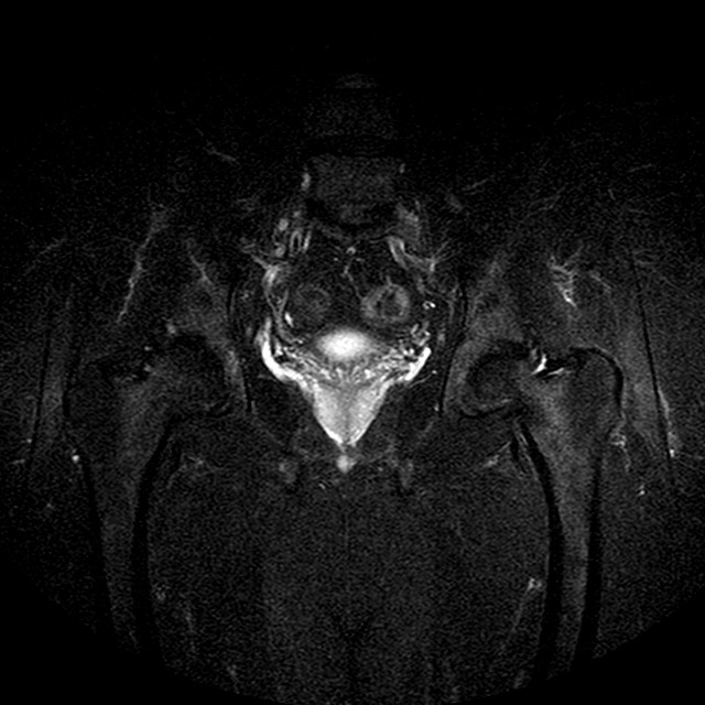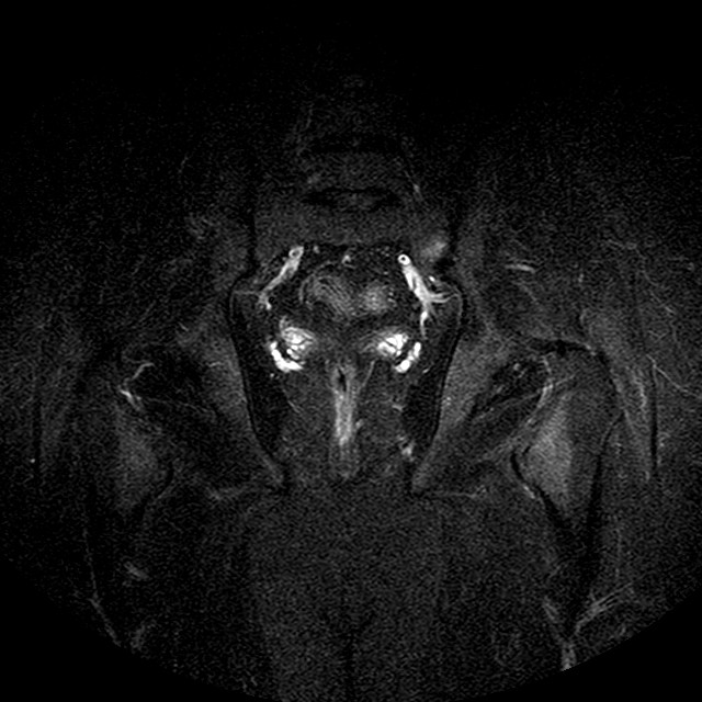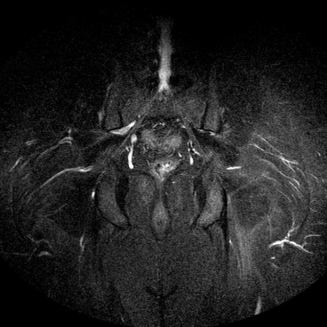 Evidenti e simmetriche alterazioni osteofitosiche in regione coxo femorale con riduzione delle rime articolari. Degenerazione completa del cercine glenoideo. Non attuali segni di versamento articolare. Non segni di edema osseo che escludono attuale algodistrofia od osteonecrosi. Lieve e simmetrica riduzione del trofismo della muscolatura glutea.