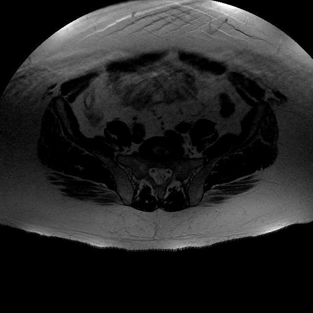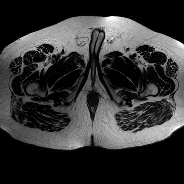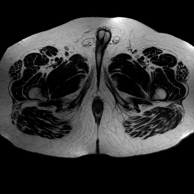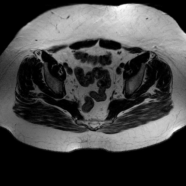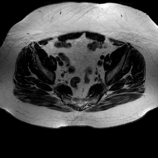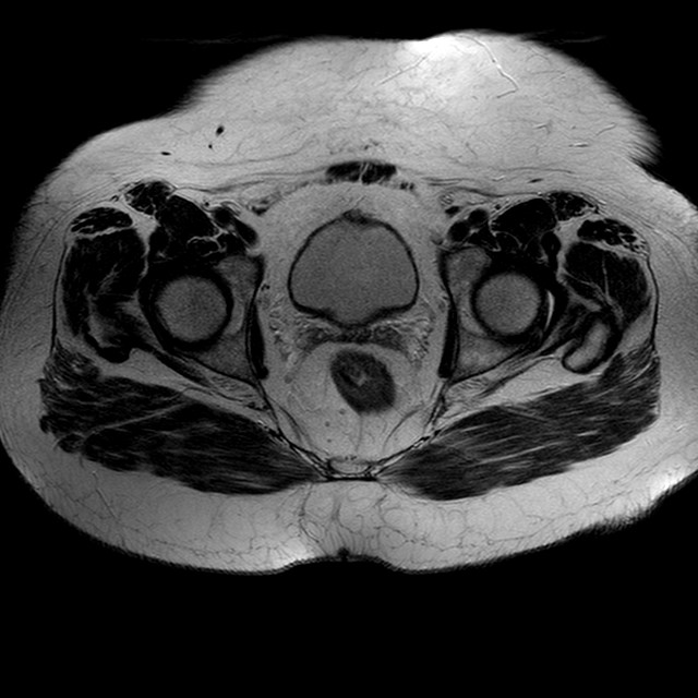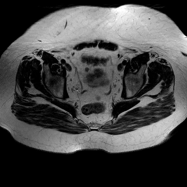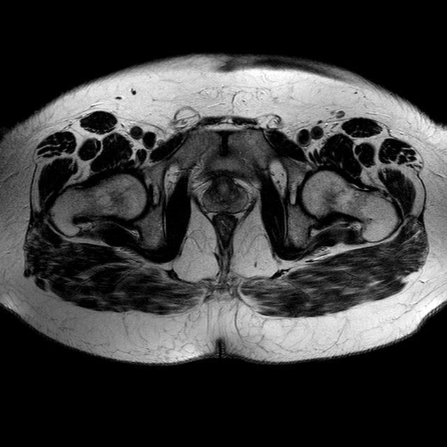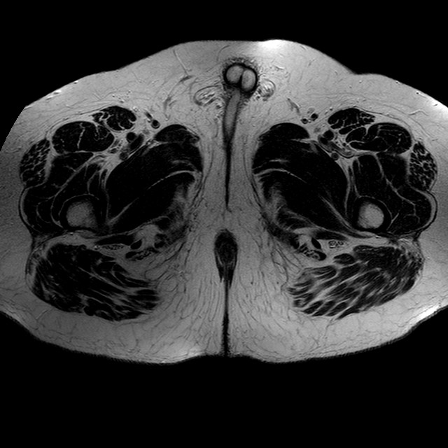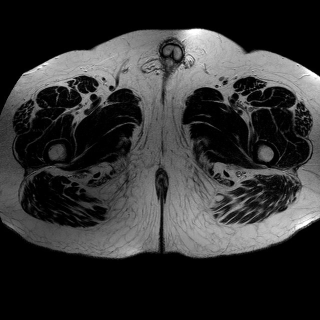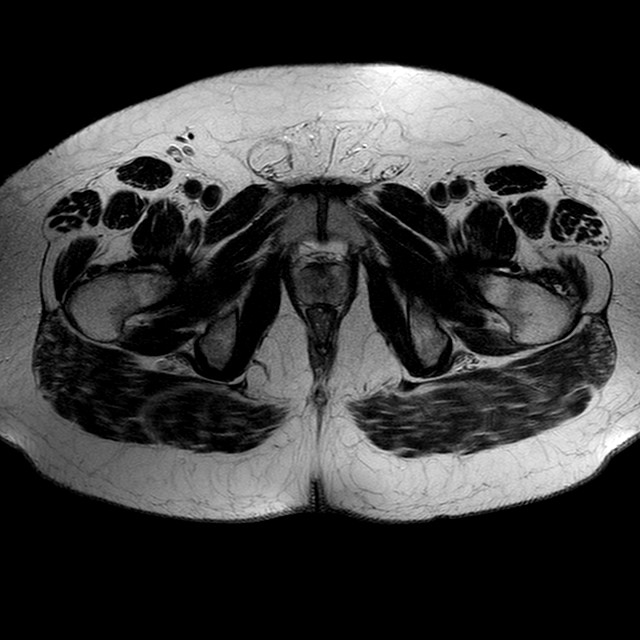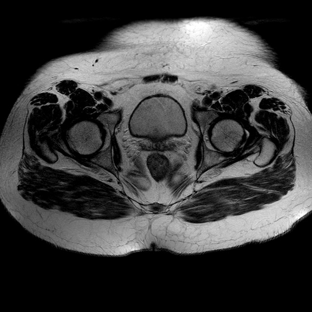 Evidenti e simmetriche alterazioni osteofitosiche in regione coxo femorale con riduzione delle rime articolari. Degenerazione completa del cercine glenoideo. Non attuali segni di versamento articolare. Non segni di edema osseo che escludono attuale algodistrofia od osteonecrosi. Lieve e simmetrica riduzione del trofismo della muscolatura glutea.