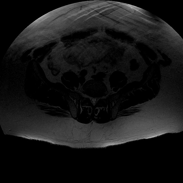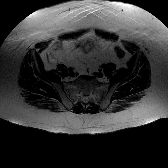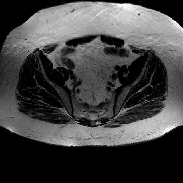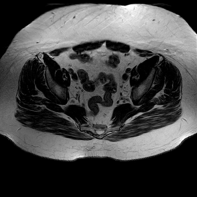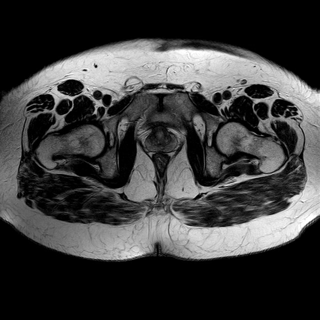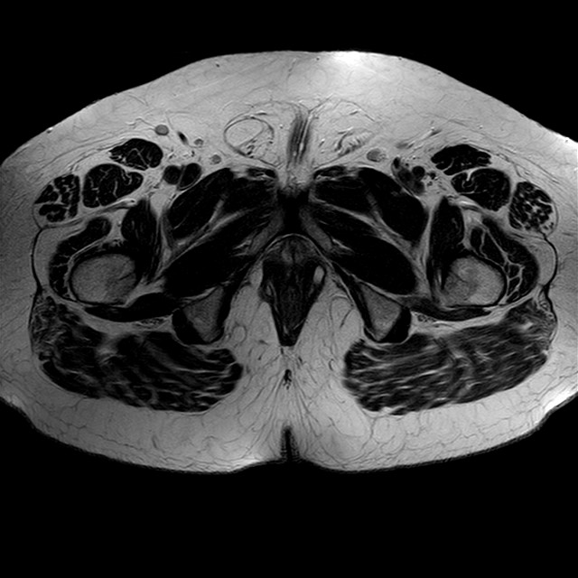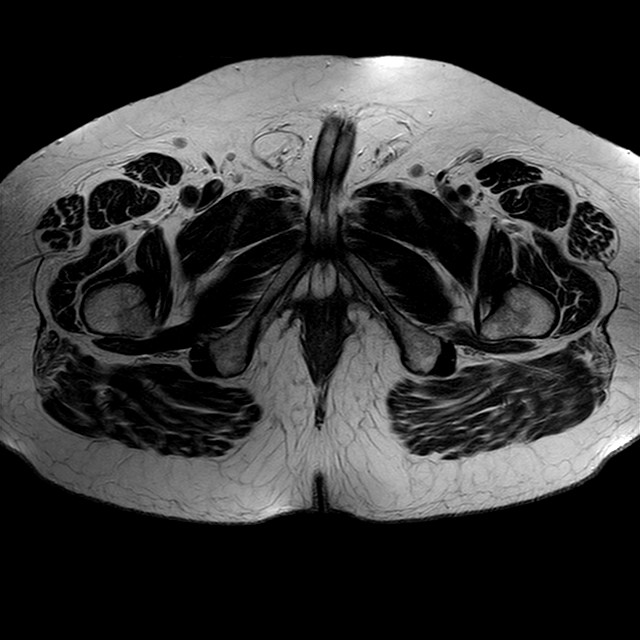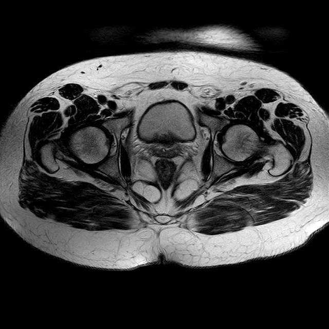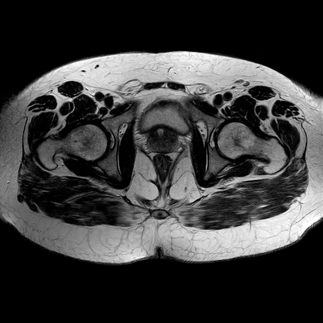 Evidenti e simmetriche alterazioni osteofitosiche in regione coxo femorale con riduzione delle rime articolari. Degenerazione completa del cercine glenoideo. Non attuali segni di versamento articolare. Non segni di edema osseo che escludono attuale algodistrofia od osteonecrosi. Lieve e simmetrica riduzione del trofismo della muscolatura glutea.